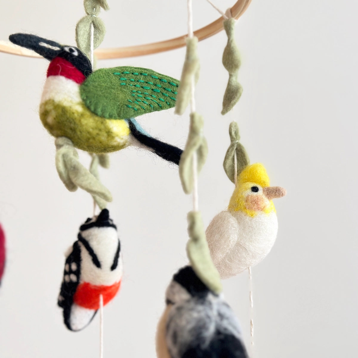 This adorable mobile was handcrafted from wool in Nepal, and features colorful songbirds and leaves. It pairs perfectly with Jasper and Ruby nursery prints.